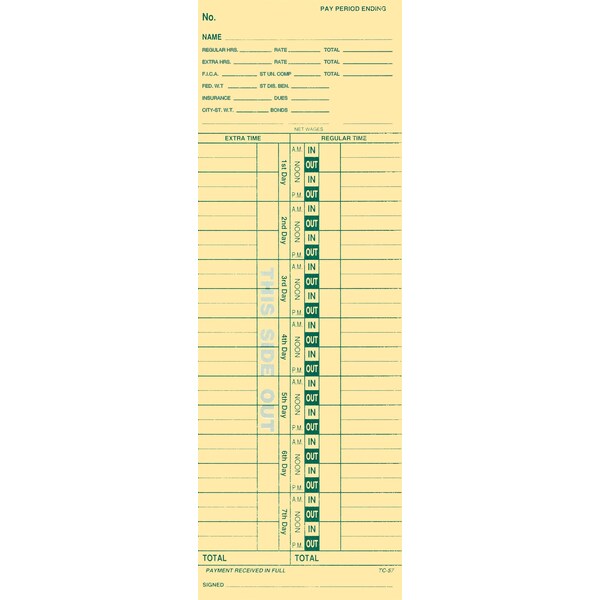 Manual style time cards. Four styles to choose from. Printed on heavy duty 125# manila stock. / - 1-part - 125# manila stock - Backer printing available at additional charge - Packaged 250 per pack - 3-1/2 x 10-1/2 - Prints in Green ink