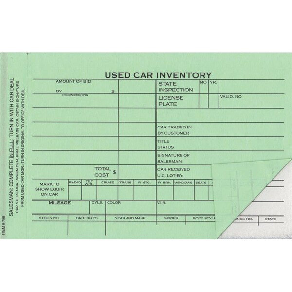Used Car Inventory Card, 6 5/8" X 4 1/4" - 2 Part, 100 Per Pack Pk