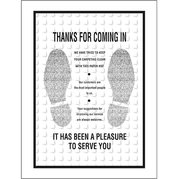 Made of heavy-duty, super-absorbent paper, coated on back. Waffle design holds dirt and water. Waffling helps keep mat in place! No sliding around. / - 16 x 21 - Prints in Black ink - Extremely durable - Packaged 250 per box