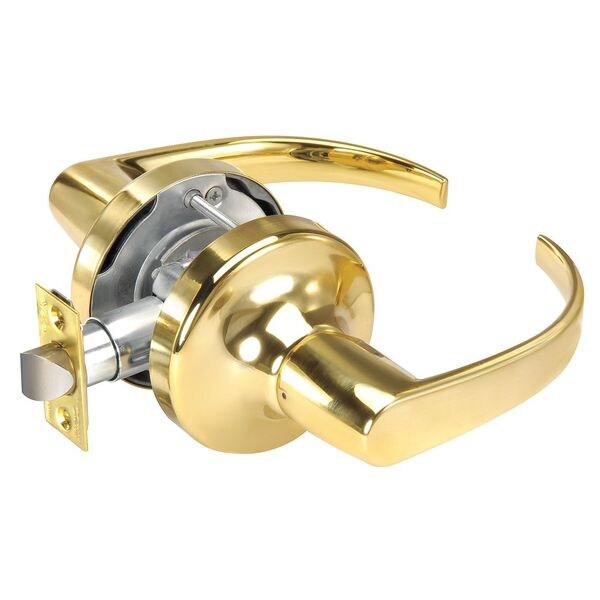 Lever Lockset, Cylindrical, Commercial, Pacific Beach (Curved) Style, Bright Brass Finish, Function Passage, Grade 2, Material Handle Cast Steel, Rose Cold Forged Brass, For Door Thickness 1 3/8 to 1 3/4 In., Backset 2 3/4 In., Front Size Dimension 1 1/8 In., Crossbore Size 2 1/8 In., Keying Different, Number of Keys 2, Pins 6, 2 3/4 x 1 1/8 Strike, Required Door Thickness 1 3/8 to 1 3/4, Cylinder, Keyway Type Para, For Use With Hollow Metal an Wood Doors, Includes Free Wheeling Lever