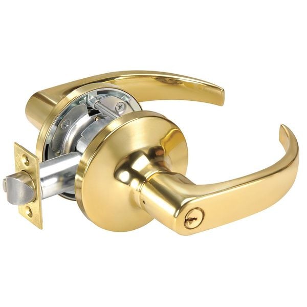 Lockset, Lever, Commercial, Pacific Beach ( Curved) Style, Bright Brass Finish, Function Storeroom, Grade 1, Material Heavy Gauge Steel, For Door Thickness 1 3/4 In., Backset 2 3/4 In., Front Size Dimension 1 1/4 In., Crossbore Size 2 1/8 In., Keying Different, Number of Keys 2, Pins 6, 1 1/4 x 4 7/8 ANSI Strike, Cylinder, Keyway Type Para, Standards ADA ANSI 117.1, UL LISTED, Fire Rated 3 Hours, For Use With Wood or Hollow Metal Doors
