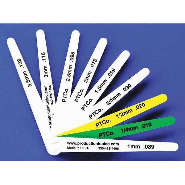 Feeler Gauge, Finish Uncoated, Blade Length 100 mm, Blade Material Plastic, Blade Style Long Blade, Dimension Type Metric, Included Certification Not Applicable, Non-Marring No, Number of Feeler Blades 9, Tolerance +/-5 Percent, Blade Width 12 mm, Included Blades 0.25mm, 0.5mm, 0.75mm, 1.5mm, 1mm, 2.5mm, 2mm, 3.5mm, 3mm, Locking Device No, Markings Metric, Non-Magnetic Yes