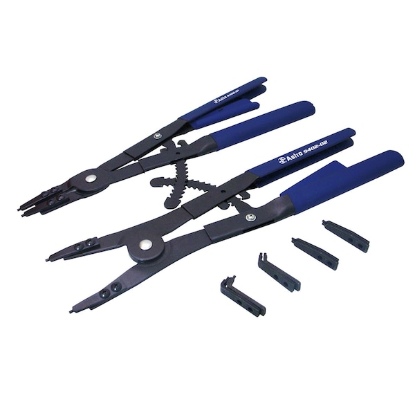 The Astro Tools 9402 2pc. Large 16 in Snap Ring Pliers Set is an internal/external heavy duty circlip pliers Set, features replaceable points and spring ratchet locking mechanism to securely hold against circlip tension. Internal/External heavy duty Circlip Pliers Set Features replaceable points and spring ratchet locking mechanism to securely hold against circlip tension Tip Diameter: 0.12 in (3mm) Internal = 3 1/2 in to 3/8 in (for 3 1/16 in - 6 1/4 in Snap Rings) External = 1/4 in to 3 3/16 in (for 3 1/2 in - 6 1/2 in Snap Rings) Spread: 3 1/4 in (85mm) Length 16 in (400mm) Tip Size 0.12 in (3.0mm) - 0Degrees 45Degrees 90Degrees Set