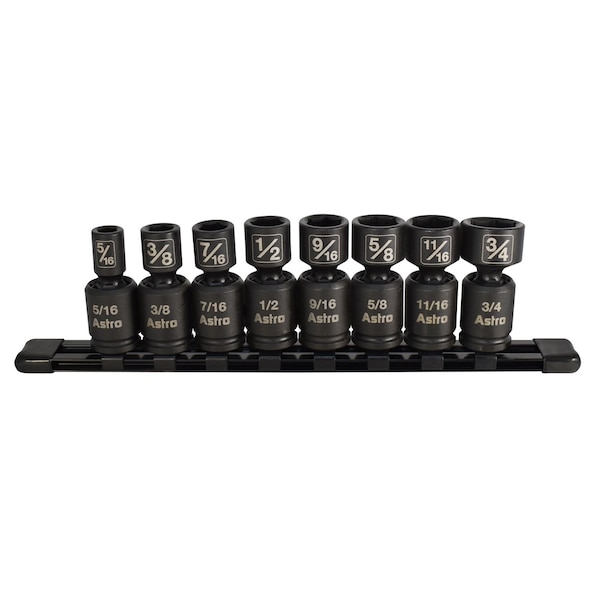 The Astro Tools 78340 SAE 8-Piece 3/8-Inch Drive Nano Pinless Universal Impact Sockets are up to 11% shorter than standard low-profile Universal impact sockets and are made from cro-mo. The pinless design in these sockets allow for a full 360 Degrees of freedom for the Universal head to angle and rotate. As a result, the new hex ball swivel design takes more abuse than thewinged Designs by transferring more of the impact force to the bolt itself. Pinless design allows a full 360 Degrees of freedom for the universal head to angle and rotate Astros Nano form factor, up to 11% shorter than standard low-profile universal impact sockets Forged CRO-MO Includes sizes 5/16, 3/8, 7/16, 1/2, 9/16, 5/8, 11/16 and 3/4 in