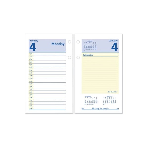 Yellow highlighted section for notes and to-do's. One day per two-page spread ruled for appointments; full weekends. Past, current and future months reference. Monthly tabs for easy referencing of dates; easy snap-in feature. features: calendar format: daily edition year: 2022 size: 3-1/2" x 6" appointment ruling: 30-min, 7 am to 5 pm (sun.-fri.) calendar term: 12-month (jan.-dec.) includes removable monthly tabs larger quantity quotes available. Please call 1-888-978-7759. this product arrives to most customers in 2-3 business days.