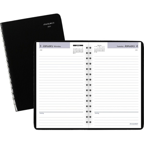 Keeping track of your schedule is easy when you use this smartly designed, daily appointment book. One-page-per-day format offers ample ruled space, a two-color design, count of days/days remaining, holidays, and no appointment times for flexible scheduling. Current and future months reference spans two days. Dated planning pages range 12 months from January to December. Wirebound appointment book also has a simulated leather cover and is nonrefillable.