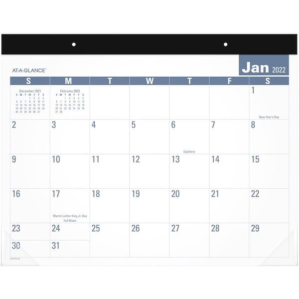 E-Z Read Desk Pad features more writing space for each day with large easy-to-read numbers. Durable backboard provides a sturdy writing surface. Dated planning pages range 12 months from January to December. The one-page-per-month format offers large unruled daily blocks, Sunday-through-Saturday scheduling, holidays, and past and future months reference on each month. Block size measures 2-15/16" x 2-1/2". Desk pad also features a bonus page with future-year reference, wide black paper headband and two clear poly corners on the bottom to secure planning pages.