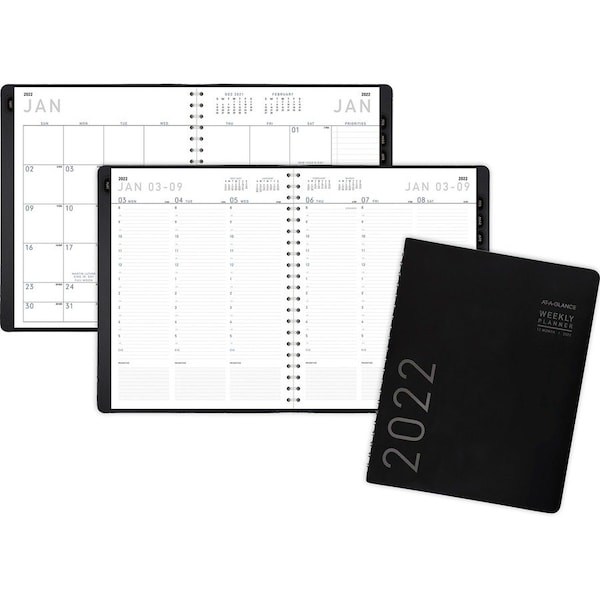 Weekly appointment book features a suede-like cover with contemporary design for a modern-day look. Special information pages offer plenty of space for note-taking and project management. Dated planning pages range 12 months of planning from January to December. Two-page-per-week spreads include ruled daily columns with a ruled space for priorities, Monday-through-Sunday scheduling, half-hourly appointment times from 8 AM to 5:30 PM on weekdays, ruled notes area, count of days/days remaining, and federal holidays in red. Tabbed two-page-per-month spreads feature unruled daily blocks, Sunday-through-Saturday scheduling, ruled column for priorities and notes, count of days/days remaining, federal holidays in red, and past and future months reference. Wire-bound appointment book also has a simulated leather cover and is nonrefillable.