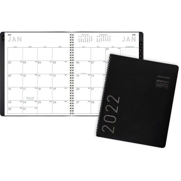 Monthly planner features a suede-like cover with a contemporary design for a modern-day look. Dated planning pages range 12 months from January to December. Tabbed two-page-per-month spreads feature unruled daily blocks, Sunday-through-Saturday scheduling, ruled column for priorities and notes, count of days/days remaining, federal holidays in red, and past and future months reference. Wirebound monthly planner is nonrefillable.