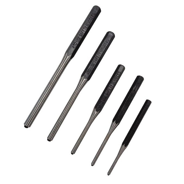 Set 1/8-inch, 5/32-inch, 3/16-inch, 1/4-inch and 5/16-inch roll pin punches; Manufactured to .000-.010 tolerance; Vinyl roll pouch included; Shipping Weight: .08 lbs.