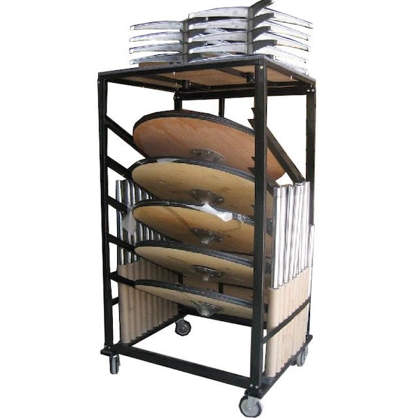 Cocktail Table cart can hold up to 10 cocktail tables and all parts, including bases and poles. Commercial grade steel construction assures strength and durability. 40"W x 34"D x 79"H