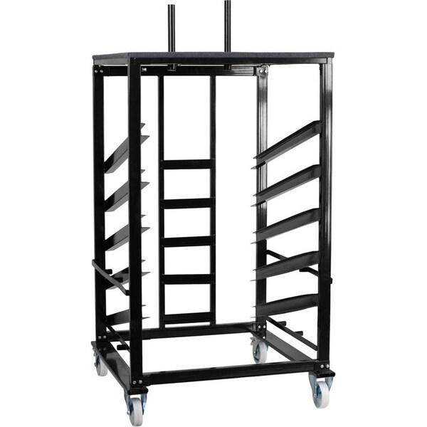Cocktail Table cart can hold up to 10 cocktail tables and all parts, including bases and poles. Commercial grade steel construction assures strength and durability. 40"W x 34"D x 79"H