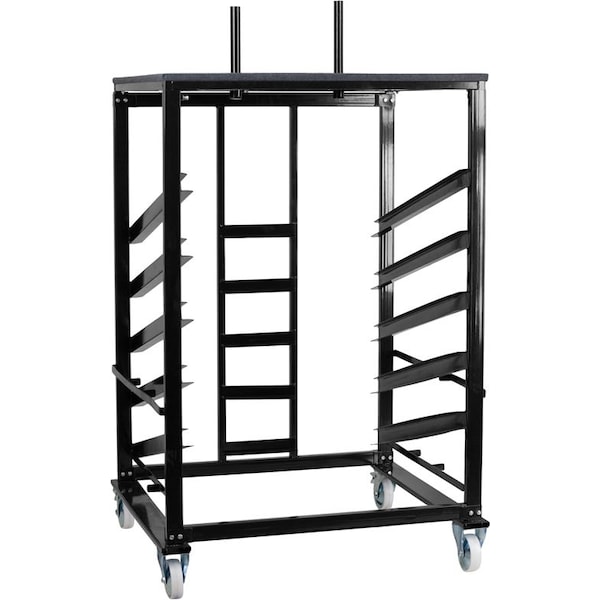 Cocktail Table cart can hold up to 10 cocktail tables and all parts, including bases and poles. Commercial grade steel construction assures strength and durability. 40"W x 34"D x 79"H