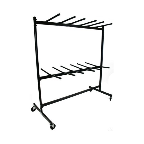 Hanging Chair Cart can hold 84 metal folding chairs, 60 wood folding chairs or resin folding chairs and 120 plastic folding chairs. rubber stoppers on hanging bars prevents chairs from falling off.