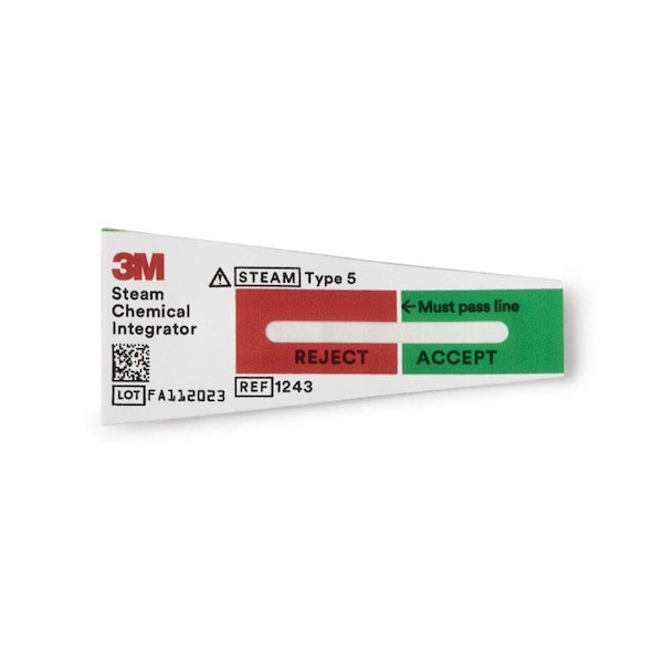 Attest Sterilization Chemical Integrator Strip Steam 2 Inch Moving front ink technology with vibrant Accept Green and Reject Red zones for easy interpretation within seconds 3M Attest steam chemical integrators are used for pack control monitoring compliant with ISO 11140-1: 2014. Please review the instructions for use for applicable cycles in the U.S. The integrator is designed to correlate with the performance of a biological indicator at three time/temperature relationships White/red colored back: Makes the chemical integrator easy to find if/when it flips over within a surgical tray Category 5 Integrating Indicators 2-year shelf life Strips are 2 inches long