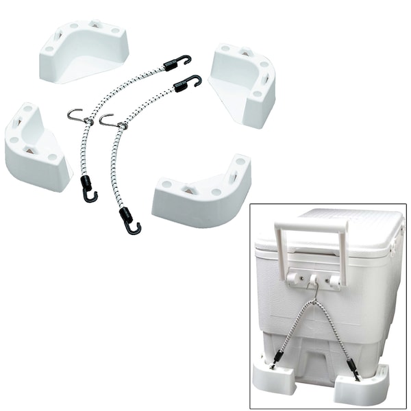Cooler Mounting Kit Coolers corners stay put with straps to prevent injury, boat and cooler damage Quick disconnect strap design Corrosion proof Fastens with #8 screws