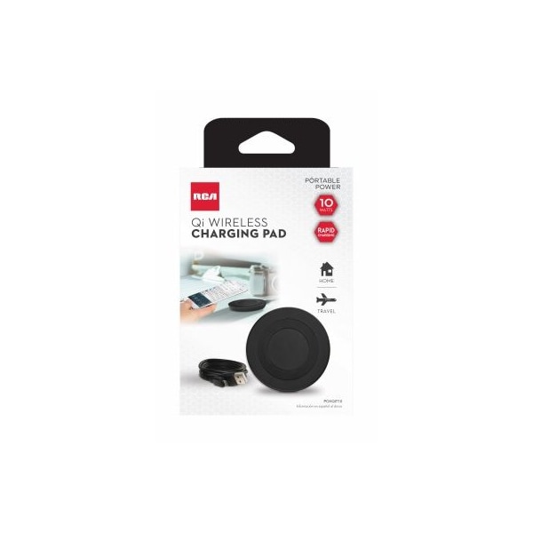 Jensen 10W black Qi wireless tabletop charger portable power rapid charging pad. USB cable included. Just set your Qi enabled phone down and it charges. Compatible with iPhone10 Samsung Galaxy phones and other Qi enabled smartphones. Small size for convenience in home or traveling. Shape square with rounded corners.