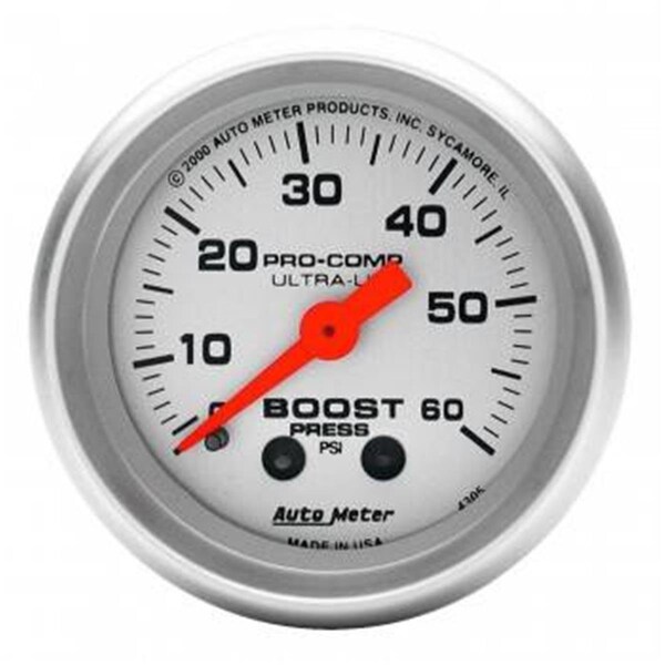 Motor State Distributing has set the pace for high-performance automotive components for racing, street, and off-road use. Mechanical boost gauges have become the staple in boost pressure monitoring for all types of engines, gasoline, diesel, or otherwise. Ultra-precise bourdon tube meter movement ensures accuracy and durability not seen anywhere else in the industry. A simple 1/8in NPT pressure connection requires no electrical hookup for operation. Includes 1/8in NPT fittings and nylon line kit. Features Traditional incandescent lighting illuminates around the perimeter of the dial AutoMeters race proven mechanical instruments provide trusted accuracy while being simple to install No electrical system required for gauge operation - compatible with every street or race vehicle Ultra-Lite Mechanical Boost Gauge Specifications Size: 2.06 in.