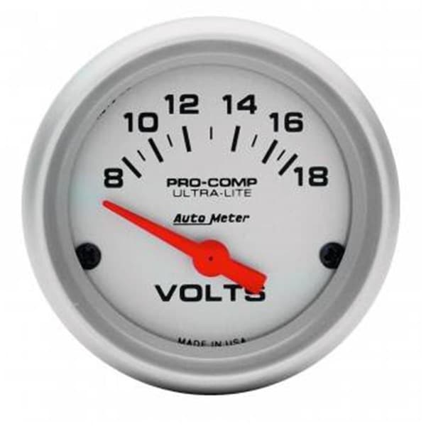 Motor State Distributing has set the pace for high-performance automotive components for racing, street, and off-road use. Keep tabs on the health and output of your vehicles electrical system safely and accurately. With a patented air core meter movement, this gauge operates with category defining accuracy anywhere from 8-18 volts on negative ground electrical systems. Installation is simple and it can keep you from being stranded on the side of the road. Features Traditional incandescent lighting illuminates around the perimeter of the dial 12 and 16 volt compatible, well-suited with nearly every street car or race car electrical system Mini Ultra-Lite Electric Voltmeter Gauge - 8-18V Specifications Size: 2.06 in.