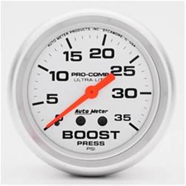 Features -Gauge Style - Auto Meter Ultra-Lite -Gauge Type - Boost pressure -Gauge Range - 0-35 psi -Gauge Size - 2 5/8 in. diameter -Gauge Size - 67.00 mm. diameter -Sweep - Full sweep -Gauge Face Color - Silver -Gauge Number Color - Black -Pointer Color - Orange -Bezel Finish - Silver -Gauge Series - Analog -Footnotes - 28 - Includes 10 ft. nylon tubing with NPT fittings. -33 - Includes 1/4 in. NPT adapter/fitting.