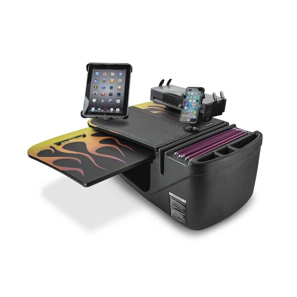 The classic hot rod flames have been around since the 1930�s and popularized over the years in many movies and pop culture. Now you can add some hot rod flames to your wheels! AutoExec has released three unique hot rod flames styles to decorate our vehicle desks. Choose from Hot Rod Orange, Blue Steel and Candy Apple Green. Add some flare in your front passenger seat while you work in your vehicle. It�s a faster mobile office!�Even with all the technology available, paper files, and traditional writing is still a necessary evil. Our GripMaster car desk is ideal for this type of work. This model is equipped with a power inverter to power all your mobile devices while you work. With the printer stand equipped on this desk, you don�t have to wait to get to your home or office to print your documents. Just place your mobile printer in the stand and start printing. The X-Grip phone mount design accommodates most smartphones easily. The X-Grip design expands and contracts allowing for a secure fit for your phone. The tablet mount provides a stable working platform, with all tablet key functions accessible. The top surface of this desk is covered with a rubber non-skid material; this ensures that a laptop, briefcase or cell phone will keep from sliding while the vehicle is in motion. This GripMaster features a pull-out writing surface with clipboard, which provides a convenient area for doing paperwork and writing. The large storage area underneath is great for office tools and accessories and for keeping a laptop out of sight. Additional storage compartments hold small supplies such as pens, maps, etc. This desk model is ideal for those needing to keep mobile equipment accessible during the day as well as needing a convenient area for writing.