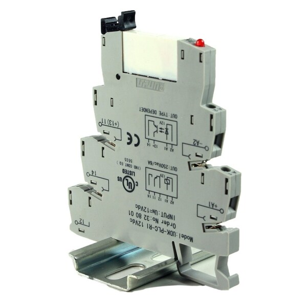 ASI328001, Type ASIUDK-PLC-RI12VDC is a 12V relay terminal block with a pluggable SPDT relay that has a 12Vdc coil and a contact rating of 6A, 250Vac. This DIN rail relay 12V is ideal as an isolation relay or interposing relay and saves space in your equipment due to the 6mm width. Features of this 12V interposing terminal block relay include screw clamp wire terminations, a locking actuator to hold in place and remove the 12Vdc relay and a LED for visual indication. The terminal block relay base in combination with the 12Vdc pluggable relay are UL508 Listed and replacement relays are available. The push in jumpers can be used to save time when inserting a jumper from one 12Vdc relay terminal block to another. Since this industrial interposing relay terminal block mounts on the standard 35mm DIN rail installation with other DIN rail mounted components is quick and easy. To ensure wiring is correct each 12Vdc terminal block relay base has the wiring diagram printed on the side.