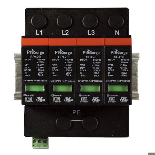 4P, Pluggable Surge Protector, Visual Indication, DIN rail mount, UL1449, 600/347Vac, MCOV 420 Vac