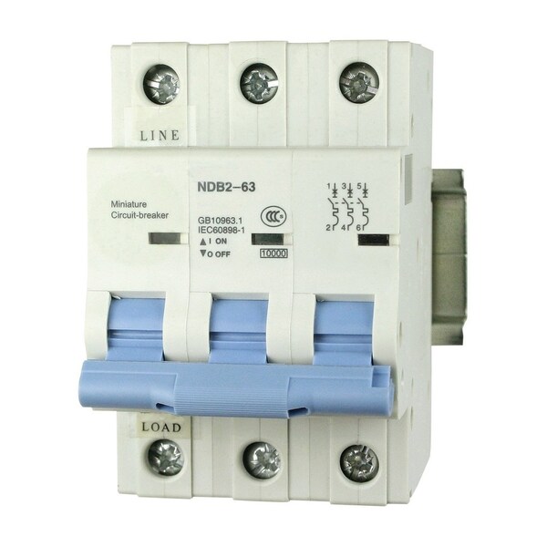 NDB2-63D50-3 is a DIN rail circuit breaker, MCB mini circuit breaker, 50 amp MCB, three pole rated for UL1077 supplemental applications. This DIN rail breaker is a thermal magnetic MCB breaker used in 480 V AC circuits. Features include 54 mm wide foot print, DIN rail mounting, visual LED indication when tripped, D trip curve for highly inductive loads, overload and short circuit protection, easy to wire screw clamp MCB terminations, RoHS compliant, and superior 10kA interrupt capacity. Certificates and standards include UL1077, IEC60898-1, GB 10963.1 and UL1077,TUV, CE, CCC. NDB2-63D50-3 is a 50 amp MCB DIN rail circuit breaker.
