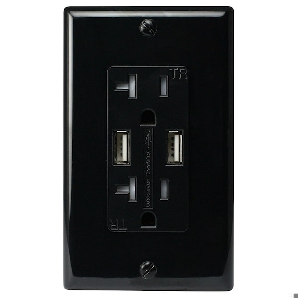 Wall Outlet 20 Amp Tamper Resistant, with USB Charging Ports 5 Amp, Black, Includes Wall Plate
