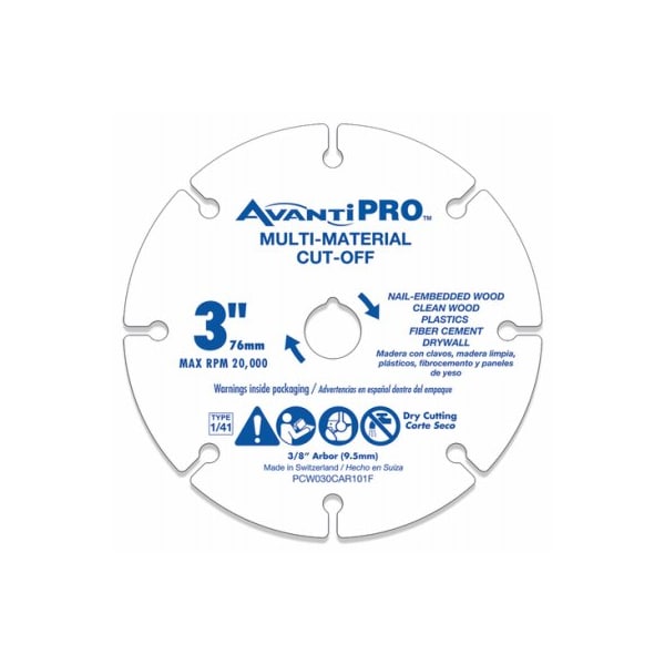 Avantipro 3 In Carbide Grit Cut Off Wheel For MultiMaterials Avantipro's Carbide Grit MultiMaterial Cut Off Wheels Features High Performance Cutting Technology For A Wide Range Of Applications These Cut Off Discs Feature A Reinforced Steel Body For Consistent Diameter When Cutting Wood, Plastic, Fiber Cement Or Drywall The Disc's Advanced Laser Melting Process Provides A LongLasting And Durable Carbide Edge Bond For Increased Durability And Long Cutting Life