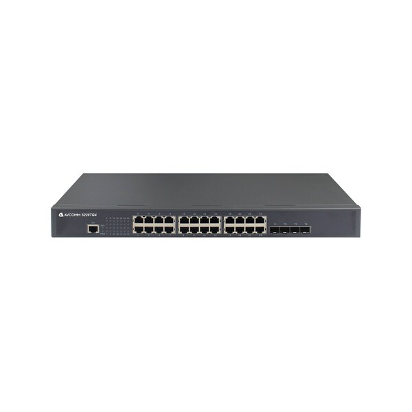 28-port industrial data switch, light 3 layer, 24 RJ45 Ports 10/100/1000Base-T(X), 4 SFP Slots 1G/10GBaseSFP+, fan-less, Rack Mounting, standard built-in power supply 100-240VAC, -10°C-50°C