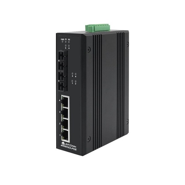 6-Port Industrial POE Unmanaged Ethernet Switch, 4 RJ45 10/100/1000BaseT(X), 2 1000BaseFX (Multimode, ST style connector) ,Support POE/POE+, Support ITU-TG.8032, DIN-Rail, Single Power Input 10-50VDC,