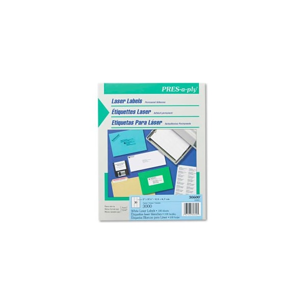Economical PRES-a-ply labels can be used for almost every addressing and identification need. Great for high-volume, low-cost printing. 8 1/2in x 11in sheets. Address LabelsFor laser printers. Shape: Rectangular; Label Size - text: 1 x 2.63; Label Colors: White; Color Family: White.