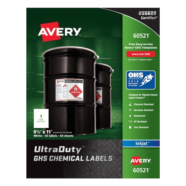 8-1/2" x 11" GHS Chemical Labels for Inkjet Printers, 50 labels/50-sheets