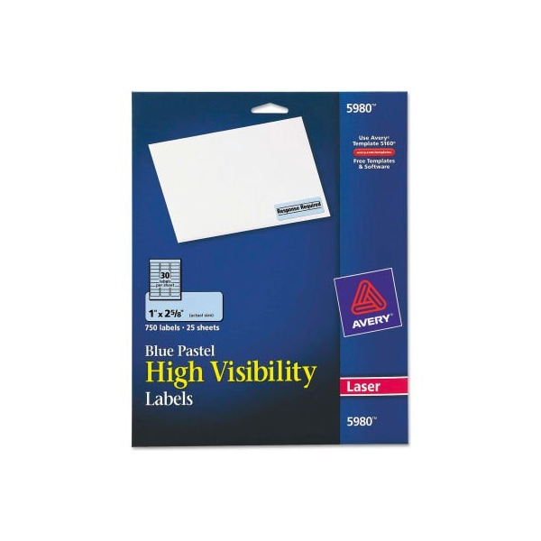 Avery high-visibility laser labels, 1 x 2-5/8, pastel blue, 750/pack capture attention with these high-visibility labels ideal for priority messages, addressing, color-coding, and identification, warning labels and more. A touch of color adds flare to mailings. Label size - text: 1 x 2 5/8; label color(s): pastel blue; machine compatibility: laser printers; material(s): paper. this product arrives to most customers in 2-3 business days.