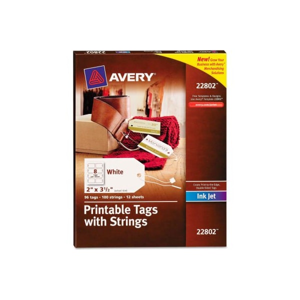 Avery blank printer-compatible tags with strings, 2 x 3 1/2, white, 96/pack create professional looking tags you design yourself. Easy to add your company logo, branding or product information with these two-sided printable tags. Includes strings that make it easy to attach or hang tags. Size: 2" x 3 1/2"; color(s): white; material(s): paper; fastener: string. larger quantity quotes available. Please call 1-888-978-7759. this product arrives to most customers in 2-3 business days.