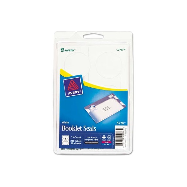 Avery booklet seals, 1-1/2" diameter, white, 240/pack ideal for mailing booklets or pieces with a bound edge. Seals are tear resistant. Permanent adhesive. Laser and inkjet compatible. This product was made from wood that came from a certified managed forest. Label size - text: 1 1/2" dia.; label color(s): white; machine compatibility: inkjet printers; laser printers; adhesive: permanent. larger quantity quotes available. Please call 1-888-978-7759. this product arrives to most customers in 2-3 business days.