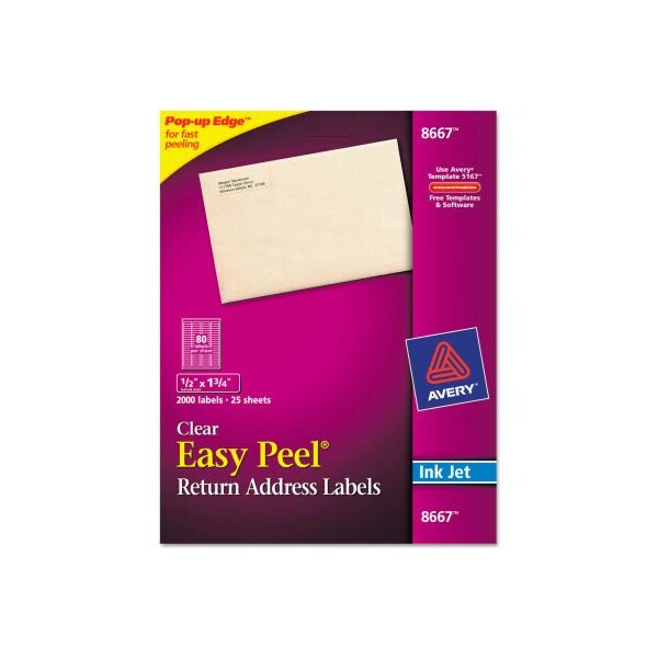 Avery easy peel inkjet mailing labels, 1/2 x 1-3/4, clear, 2000/pack create a professional, printed-on look. Virtually disappear on colored and textured surfaces. To speed up labeling, simply bend the sheet edge to expose the pop-up edge, peel, then fold the sheet back to flat in a jiffy. Avery offers many easy-to-use templates and software solutions for labels. Label size - text: 1/2 x 1 3/4; label color(s): clear; machine compatibility: inkjet printers; material(s): paper. this product arrives to most customers in 2-3 business days.