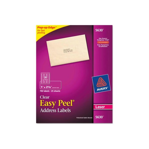 Avery easy peel laser mailing labels, 1 x 2-5/8, clear, 750/box create a professional, printed-on look. Virtually disappear on colored and textured surfaces. To speed up labeling, simply bend the sheet edge to expose the pop-up edge, peel, then fold the sheet back to flat in a jiffy. Avery offers many easy-to-use templates and software solutions for labels. Label size - text: 1 x 2 5/8; label color(s): clear; machine compatibility: laser printers; material(s): paper. this product arrives to most customers in 2-3 business days.