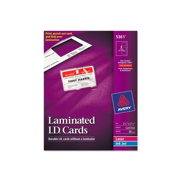 Avery laminated laser/inkjet id cards, 2-1/4" x 3-1/2", white, 30/box kit includes perforated white cards and plastic laminator all in one. Print, punch out card and fold over clear lamination. features: name badge label length: 2-1/4" name badge label width: 3-1/2" name badge label color(s): white name badge label material(s): paper sheets per unit: 10 name badges per sheet: 3 name badges per unit: 30 sheet length:11" sheet width: 8-1/2" machine compatibility: laser printers, inkjet printers this product arrives to most customers in 2-3 business days.