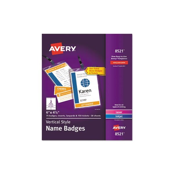 These badges feature a durable, easy-to-load, open top, pocket-style design. White micro-perforated name badge inserts are printable on both sides and separate cleanly leaving smooth edges. Create badges with text and colorful graphics using free designs and templates with Avery Design & Print. Plastic holder is reusable and displays names clearly. 8.5 x 11 sheets for laser and inkjet printers. Lanyard StyleVertical orientation with easy-to-load large-pocket design and 18 lanyard. Ideal for carrying agendas, site maps and more during conferences and special events. Orientation: Vertical; Name Badge Holder Length: 6in; Name Badge Holder Width: 4.25in; Name Badge Holder Colors: Clear.