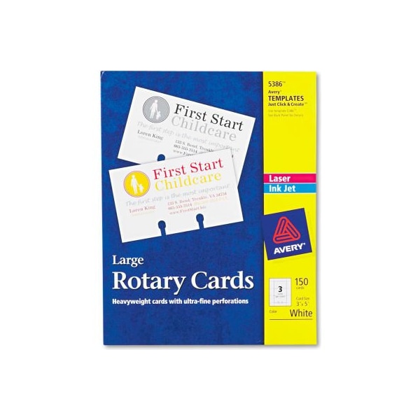Avery large rotary cards 5386, 3" x 5", 3 cards/sheet, 50 cards/box printable heavyweight card stock sheets feed automatically from paper tray. Plus, the thick card stock delivers a professional appearance and stands up to frequent use in card files. Ultra-fine perforations allow cards to be separated cleanly and easily. Avery offers many easy-to-use design and print solutions for cards. Convenient, do-it-yourself customization means you can make changes and print new cards with ease. See product package for details. this product arrives to most customers in 2-3 business days.