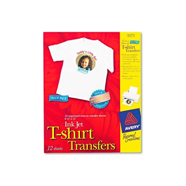 Avery light fabric transfers for inkjet printers - ave3275 - 8-1/2 x 11 - white - 12/pack create, personalize and customize your own fabric transfers. Ideal for t-shirts, aprons, pillowcases, bags, tank tops, promotional items and more. Crack-free transfer's color lasts longer so you can enjoy your creations even more. All you need is a computer, a printer that allows you to flip images and a household iron. For use on 100% cotton or cotton poly/spandex blend fabrics. Dark transfers feature a unique white layer behind the image so the design doesn't get lost on dark material. Easy to customize with complimentary designs and templates from avery design & print. For laser and inkjet printers. this product arrives to most customers in 2-3 business days.