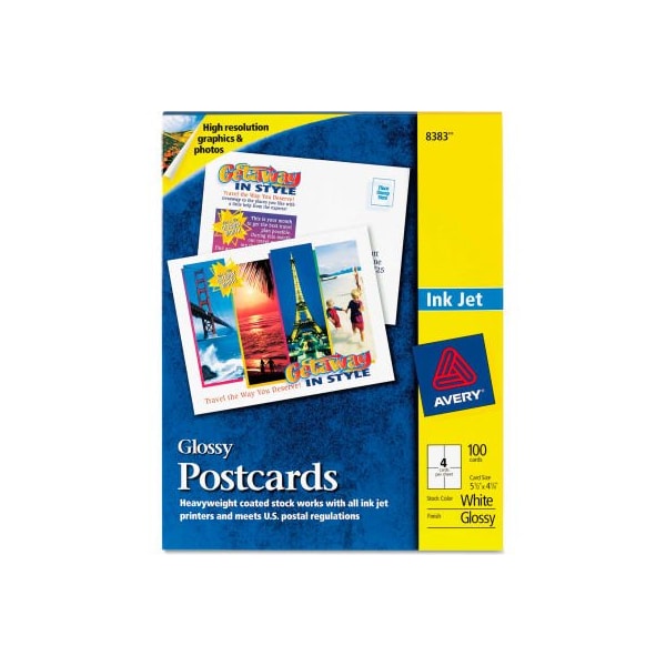 Avery photo-quality glossy postcards for inkjet printers 8383, 4" x 6", glossy white, 100/pack thick, sturdy bright white cardstock meets usps mailing standards; perfect for invitations, seasonal offers, recipes, flashcards and more. Ultra-fine perforations allow for quick and easy separation. Easy to customize using free avery design tools, qr codes and templates. this product arrives to most customers in 2-3 business days.