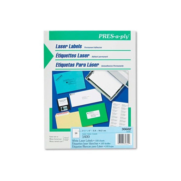 Avery pres-a-ply laser address labels, 1-1/3 x 4, white, 1400/box create a variety of custom labels using a laser printer. Automatic jam-free feeding. Label size - text: 1 1/3 x 4; label color(s): white; machine compatibility: laser printers; material(s): paper. this product arrives to most customers in 2-3 business days.