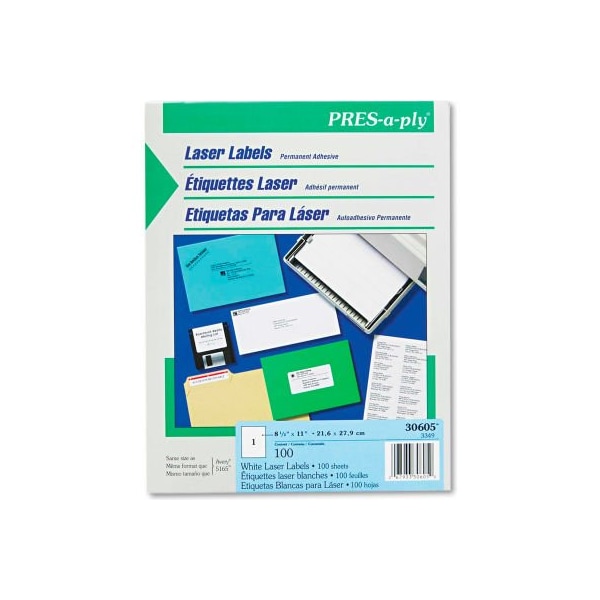 Avery pres-a-ply laser address labels, 8-1/2 x 11, white, 100/box create a variety of custom labels using a laser printer. Automatic jam-free feeding. Label size - text: 8 1/2 x 11; label color(s): white; machine compatibility: laser printers; material(s): paper. this product arrives to most customers in 2-3 business days.