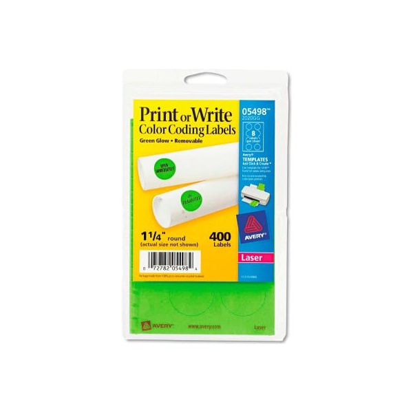 Avery print or write removable color-coding labels, 1-1/4" dia, neon green, 400/pack ideal for organizing with color. Labels stick well, remove easily, and leave no residue. Label size - text: 1 1/4" dia.; label color(s): neon green; machine compatibility: laser printers; material(s): paper. larger quantity quotes available. Please call 1-888-978-7759. this product arrives to most customers in 2-3 business days.