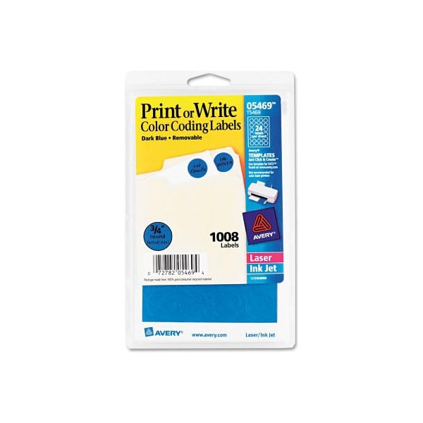 Avery print or write removable color-coding labels, 3/4" dia, dark blue, 1008/pack ideal for organizing with color. Labels stick well, remove easily, and leave no residue. Label size - text: 3/4" dia.; label color(s): dark blue; machine compatibility: inkjet printers; laser printers; material(s): paper. larger quantity quotes available. Please call 1-888-978-7759. this product arrives to most customers in 2-3 business days.