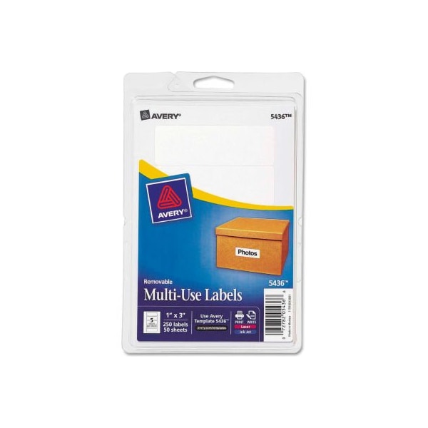 Avery print or write removable multi-use labels, 1 x 3, white, 250/pack labels stick, stay and remove cleanly without leaving a residue ideal for drawers, containers, boxes, shelves and other smooth surfaces. Removable. Label size - text: 1 x 3; label color(s): white; machine compatibility: inkjet printers; laser printers; typewriters; material(s): paper. larger quantity quotes available. Please call 1-888-978-7759. this product arrives to most customers in 2-3 business days.