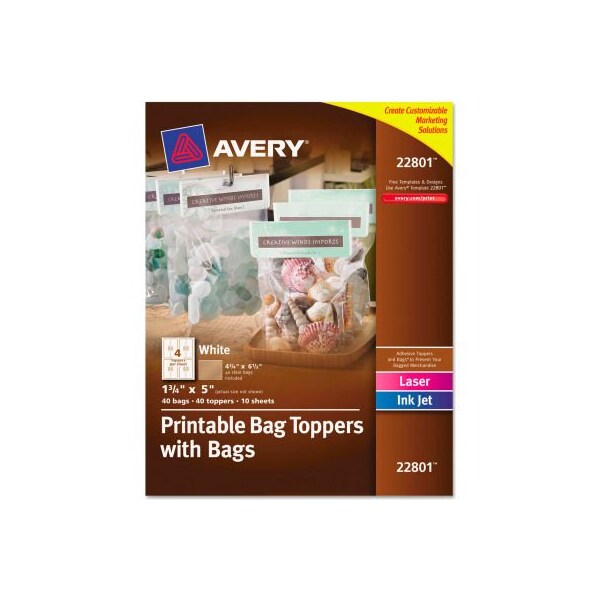 Avery printable bag toppers with bags, 1-3/4 x 5, white, 40/pack create professional retail packaging with your company name, product name or logo. Includes reseal-able 4-3/4 x 6-1/2 bags and self-adhesive toppers for quick and easy assembly. Optional perforated holes allow bags to be hung and displayed on slot or peg hangers. Easy to customize with free templates and designs available on avery desk & print online. Label size - text: 1 3/4 x 5; label color(s): white; machine compatibility: inkjet printers; laser printers; sheet (w x l): 8 1/2 x 11. larger quantity quotes available. Please call 1-888-978-7759. this product arrives to most customers in 2-3 business days.